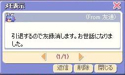 今気づいたのですが 更新するようなことがありません・・・(´・ω・`) なのでグチブログとなりますw えっとー・・・まずTルさんw 今まで名前間違っててゴメンナサイw ずっとスピルバーグだと思ってました(*/∀\*) (スティーブンってことね^^) んでムギチャw ボクはずっとボクですよ(´;ω;`) ギルド作った時から今まで・・・そして引退するまでボクですw ぁ そーいえば引退といえば・・・ 1週間くらい前にこんなメモ来てた・・・ 引退か~・・・ なんか他人事じゃない感じがするね^^; ホントは直接言いたかったけど・・・ センヤさんw 今までおつかれさまでした^^ センヤさんにこれから素敵なことがおこりますように祈ってます^^ オーロラ鯖で出来た数少ない友達でしたw あまり話さなかったけど そんなボクにメモ送ってもらって感謝してます^^ といってもこのブログ知らないんだけど(ぁ まぁせっかくなんで引退について書こうかな。 ボクもいつかは引退しようとか思ってるしね^^ でも さよなら~;; みたいな ;; ←が付く引退はしたくないな~。 そんなならメモだけで終わらせる方が楽だw どうせなら 「ぉ そっかw おつー^^イェイ♪イェイ♪」 みたいな感じがいぃなヾ(*´∀`*)ノキャッキャ まっ これは引退する側の意見^^ 残される側としては・・・ やっぱ引き止めたいよね^^; でも1回しか言わないかな。 それでも引退するくらい決心ついてるなら良いし 考え変わってくれたらなお良い^^ まぁとにもかくにも出会いがあれば別れがあるのは必然。 あとはどれだけ思い出が残せるかだね^^ リア友と違ってTS離れたらもう会うことはない・・・ けど どこかにその人がいて いつか街の中ですれ違うかもしれない。 そのときにその人と気付かないけど笑ってるといいよね^^ ぅん・・・なんか変な感じになった・・・w PR この記事にコメントする